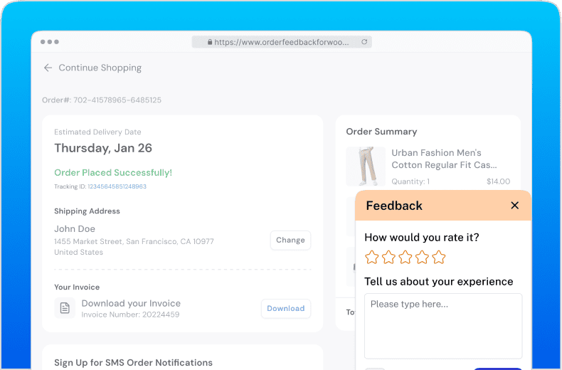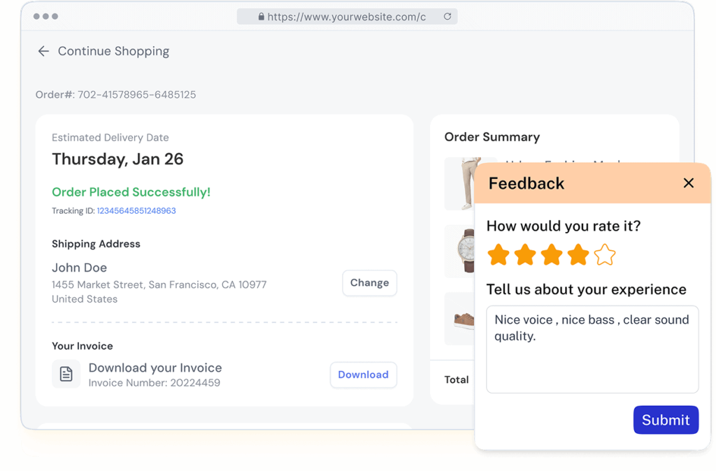 Display feedback forms effortlessly on the Thank You/Order confirmation page & Order detail page